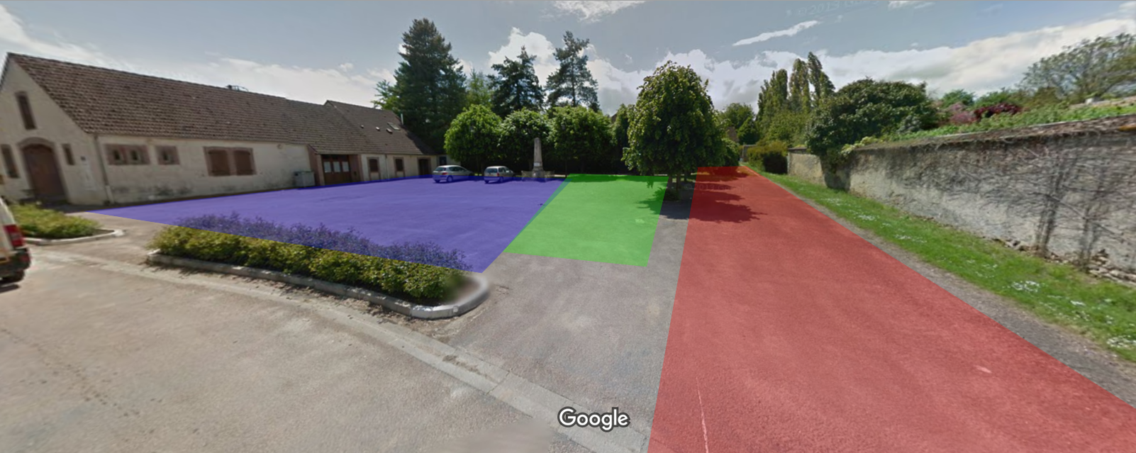(en zone verte) sans obstruer l'allée la plus à droite (zone rouge), et éviter le reste de la place (zone bleue),